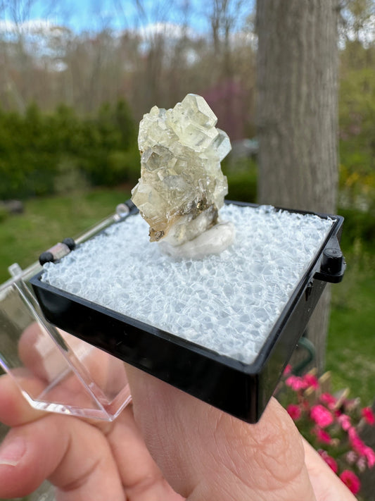 Cabinet Pyrite over Quartz with Calcite on Fluorite from Morocco