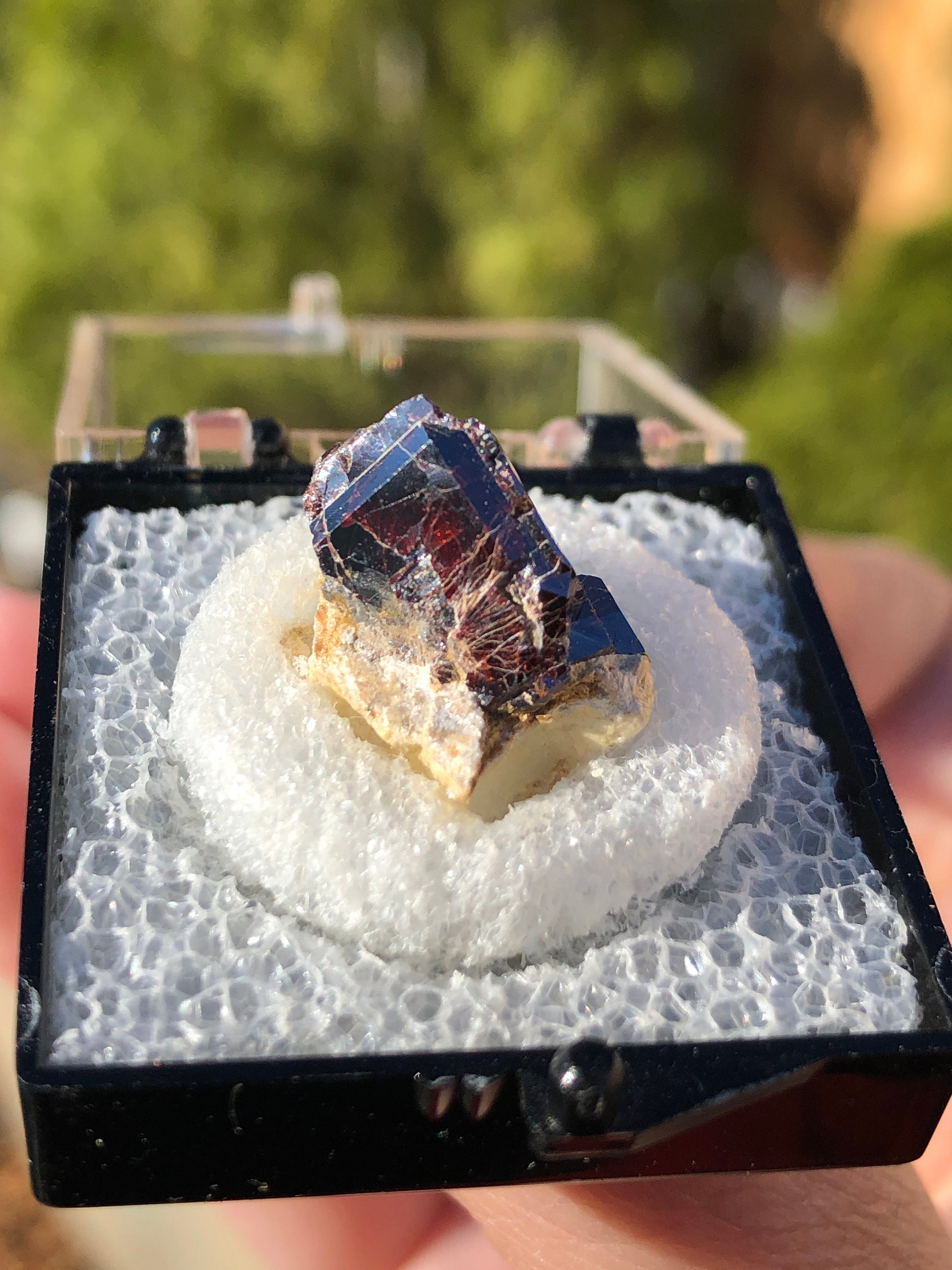 A beautiful deep red rutile crystal with a metallic luster and well-formed faces on matrix. It is from the Champion Mine, Mono County, California, USA.